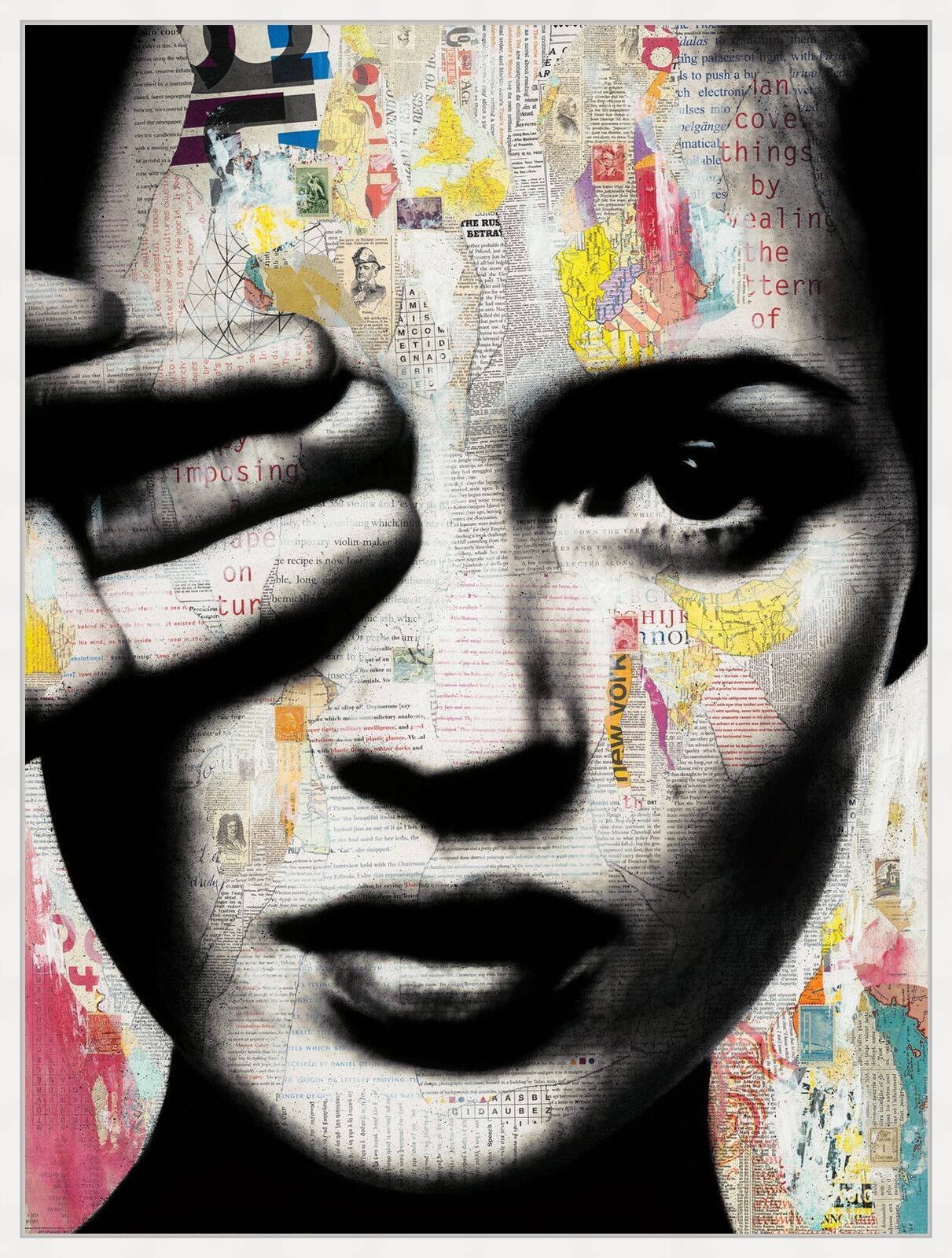 A deconstructed portrait of a modern icon, built from layered fragments of color and texture that converge to reveal a complex personality. The artist uses mixed media to explore the space between public perception and private identity, creating a face that emerges from a whirlwind of expressive paper and paint.